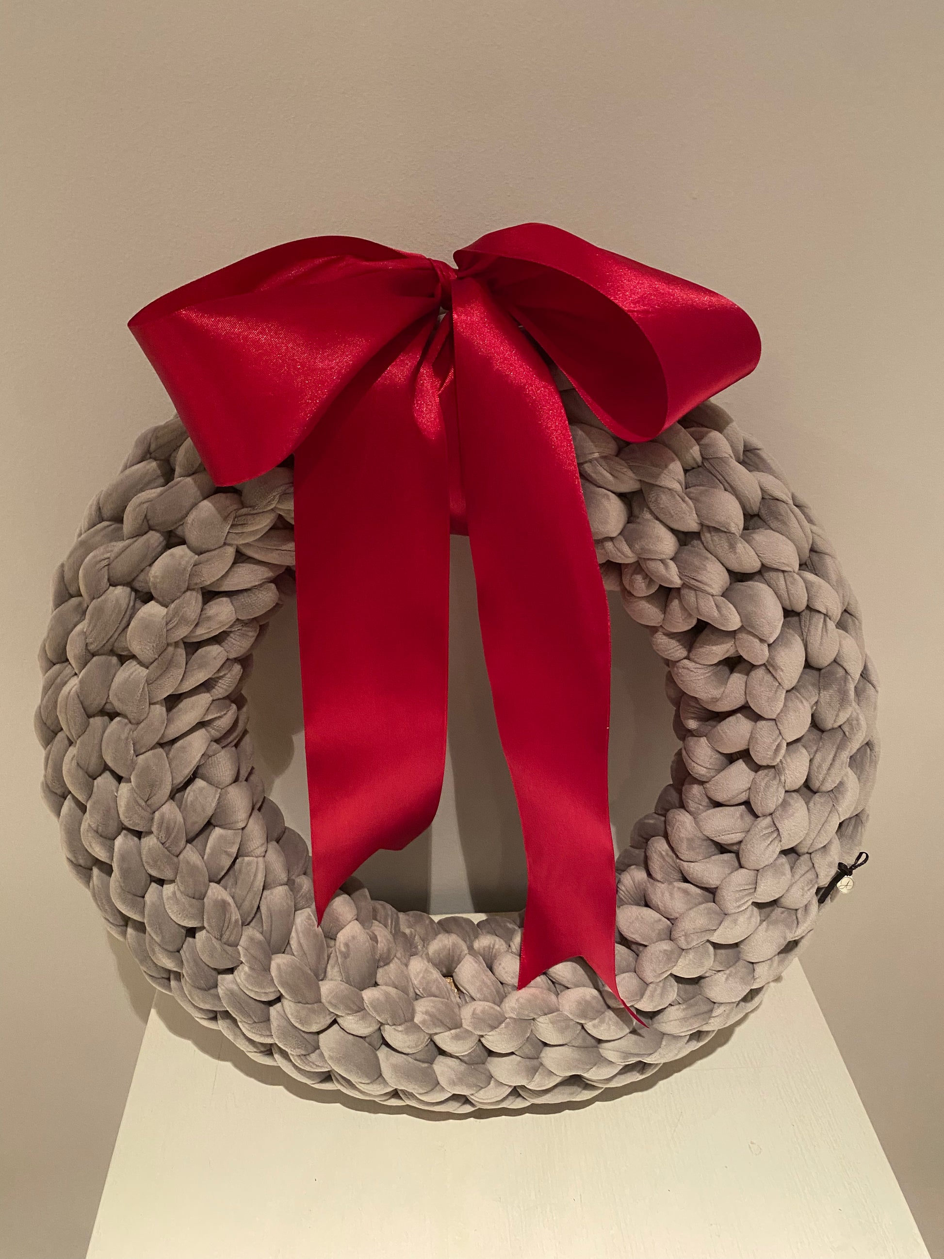 Ein Klassiker neu interpretiert: Unser handgefertigter Dekokranz aus grobem Stricksamt in edlem hellen Grau verbindet traditionelle Form mit modernem Materialgefühl.